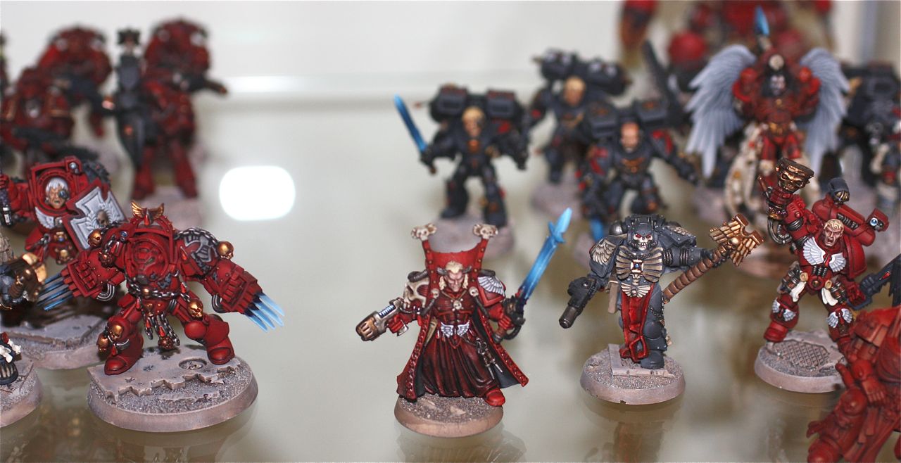 I have not applied dull coat, and I committed the terrible miniature photo taking faux pas by using a flash camera instead of my light booth, but still I could not resist putting up shots of my new Mephiston model. I am really happy with how he turned out. I used an air brush, followed by a lot of targeted washes and highlighting. The washes left him a little shiny, but that will be dealt with in time. I am painting this army in sort of coarse brush strokes, and plan to come back for rebasing as necessary for the display board, and weathering.