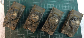 I painted these Lehman Russ tanks quite some time ago, and they've sat unloved in the very back of my display cabinet since then. As my first attempt's at Kursk style camouflage on IG vehicles, they came out ok, but not great. With my big press into ww2 modeling, I decided that I needed to figure out how to salvage these old models. On the historical side of things, I've been using a lot of filters to improve the surface texture of my models. Filters are basically really thin oil washes that soften and blend colors together. One technique I have never tried is the traditional military model's goto method of spraying dust colored paint all over the model. Since these tanks were destined to live out their remaining days hidden away in a box, it seemed a good time to give it a shot.