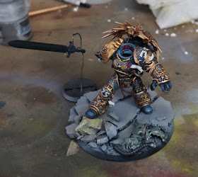 The new base has enamel curing on it right now in prep for oils, followed by dust and dirt weathering powders. To get a feel for what it will eventually look like, just imagine the grey areas a dirty steel legion drab color. The important bit for me was to see if the slightly yellow bird head, and the pale green SoH marine would complement Roboute Guilliman or not. When the grey is tan colored, I think the base will sink into the background and give a nice subdued footing to the model.